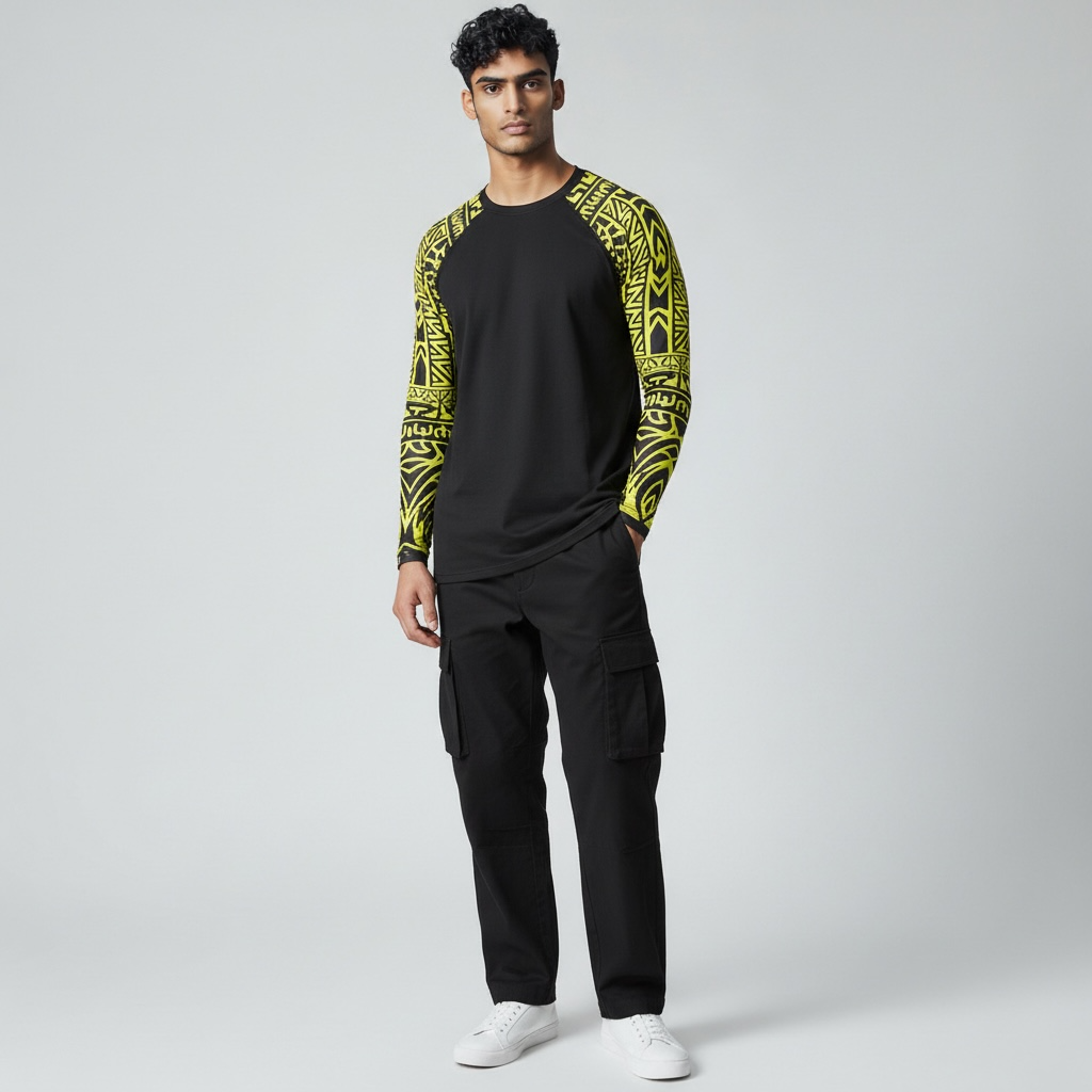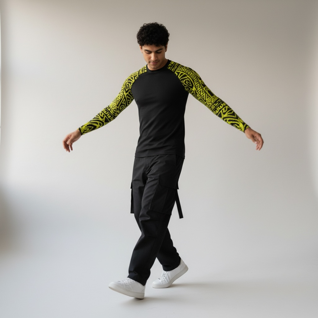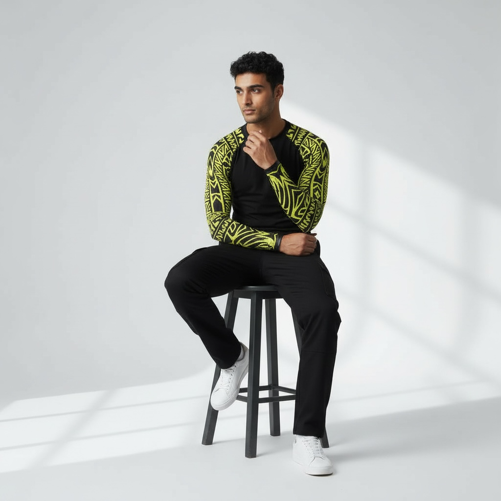 The standout feature? A neon green tattoo-inspired sleeve design, adding a bold, edgy look that embodies strength and resilience. Whether you're lifting, running, or pushing limits, this tee moves with you—because greatness never stays still.
