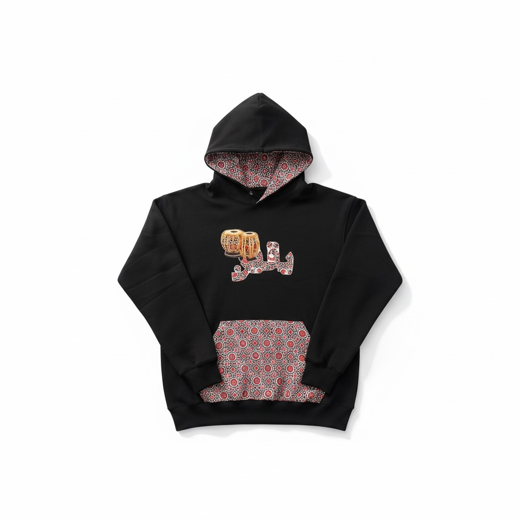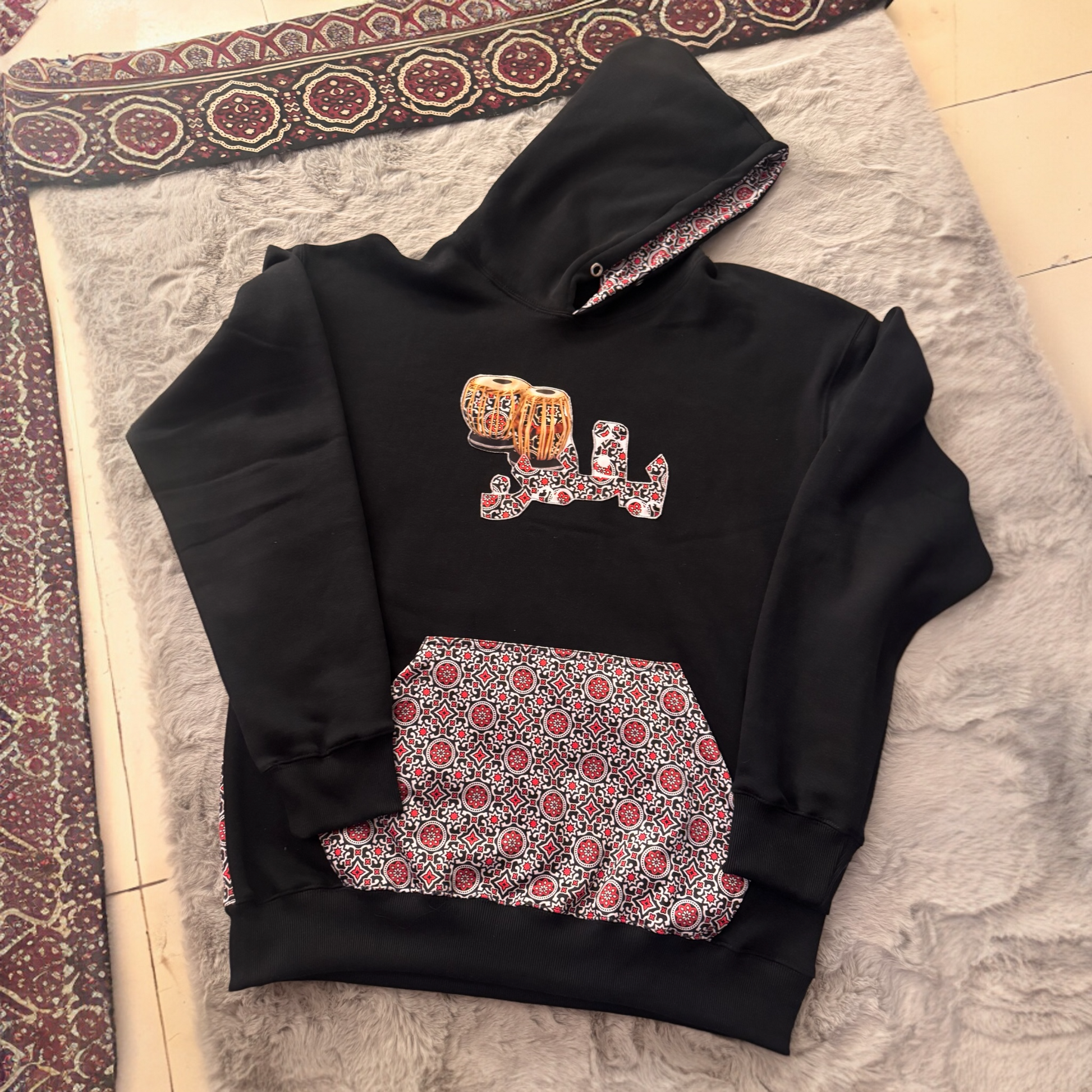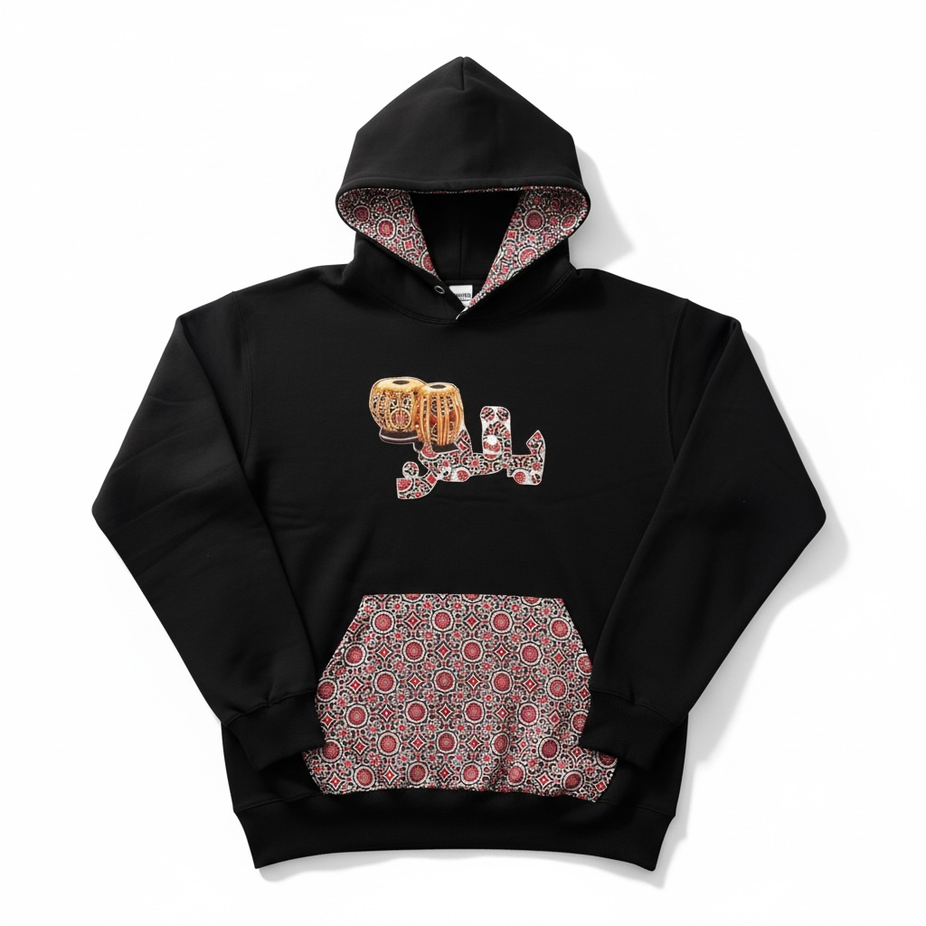 The Sada-e-Junoon Hoodie is a tribute to raw emotion, poetry, and soulful expression. Set on a deep black base, the back features a powerful artistic illustration of a Abuda Parveen in full performance, arms raised, paired with evocative Urdu verses that speak of longing, separation, and unspoken truths. The traditional Ajrak-inspired pattern adds cultural depth, making this hoodie not just apparel, but a statement piece rooted in art and heritage.