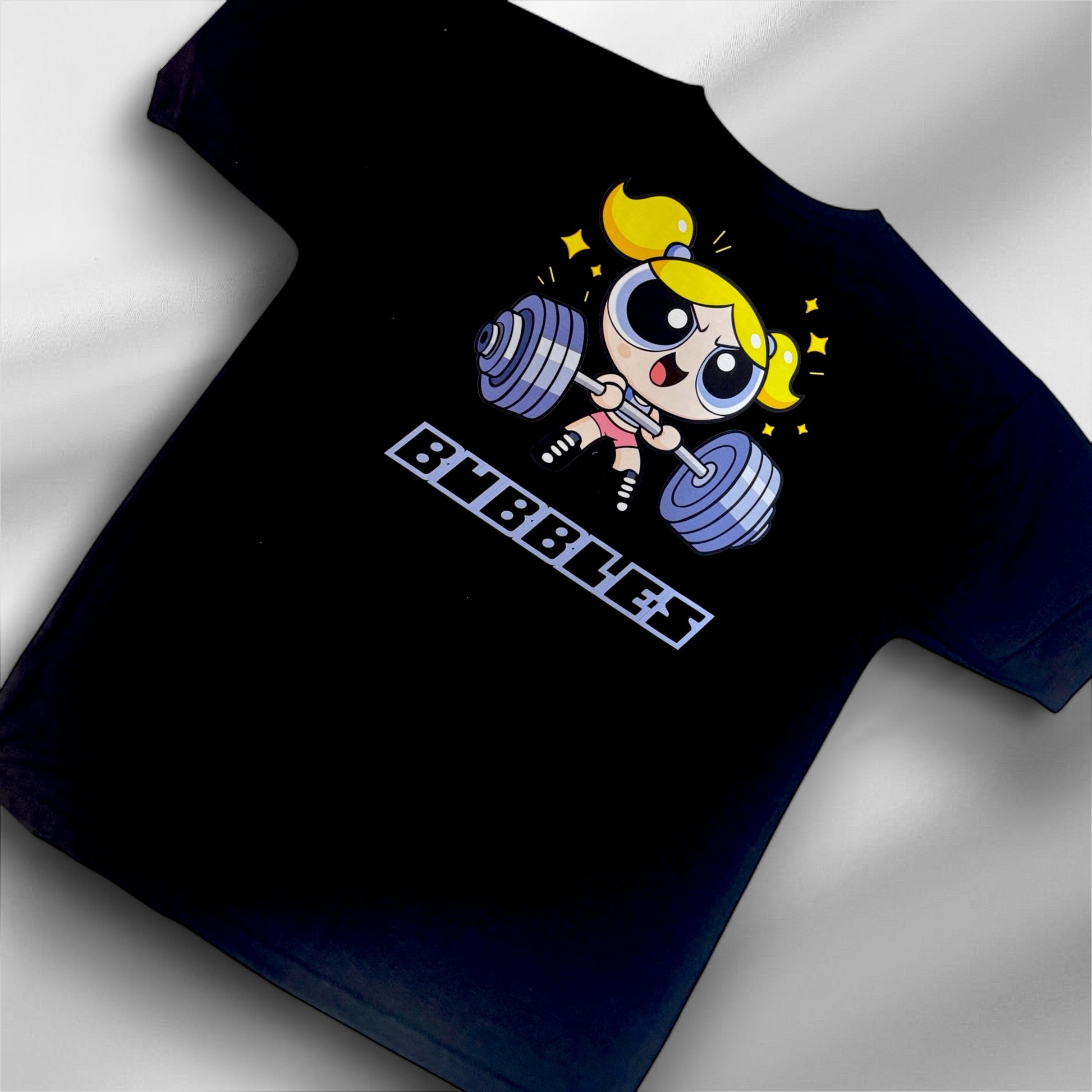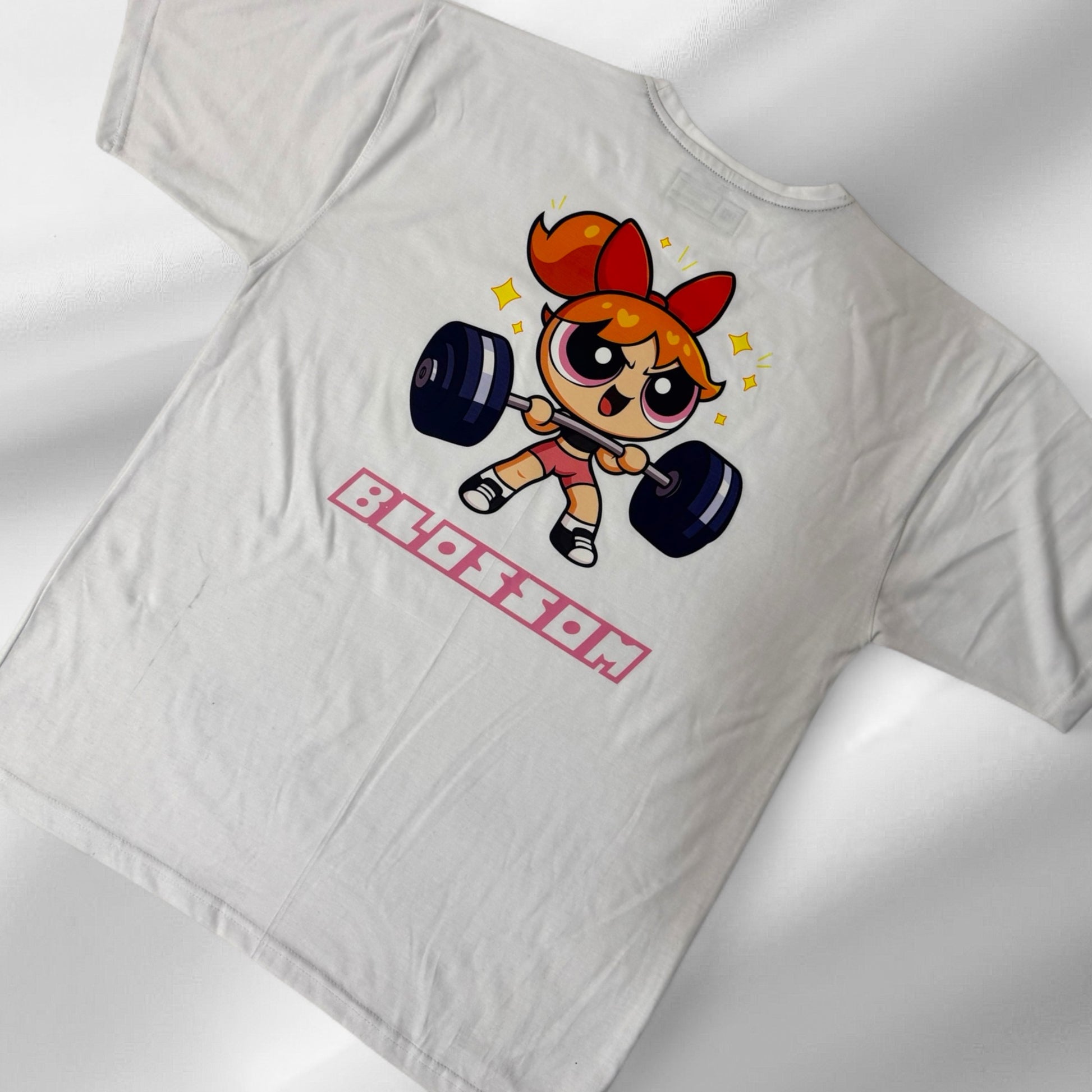 Unleash your inner hero with the Powerpuff girls oversized tees! Featuring Blossom, Bubbles, and Buttercup hitting the weights in true Powerpuff style, these shirts combine nostalgia and gym motivation in one bold look. Each design showcases a different Powerpuff Girl lifting heavy, surrounded by sparkles of strength and energy.