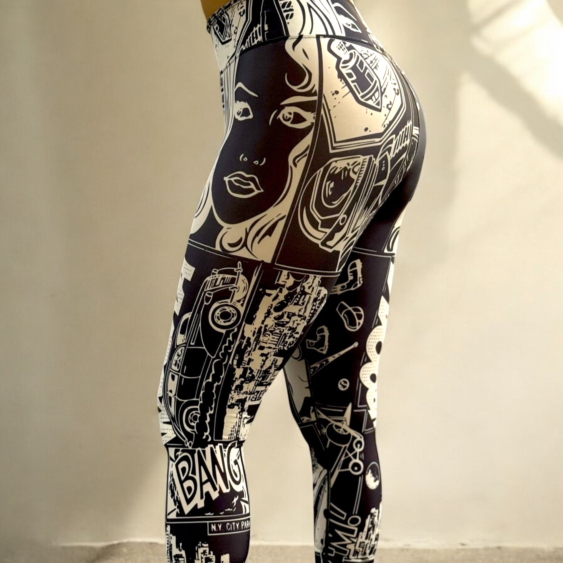 These Leggings feature a bold, Comic Book-Inspired design that instantly grabs attention. The print is a mix of striking black and white tones, filled with illustrated panels that include stylized faces, cityscapes, action scenes in a dynamic, retro-comic font. The high-waisted fit provides a sleek, flattering silhouette, keeping the look versatile and modern. Perfect for adding a playful yet edgy touch to casual outfits, workouts, or streetwear styles, these leggings combine pop-art energy with everyday comfort