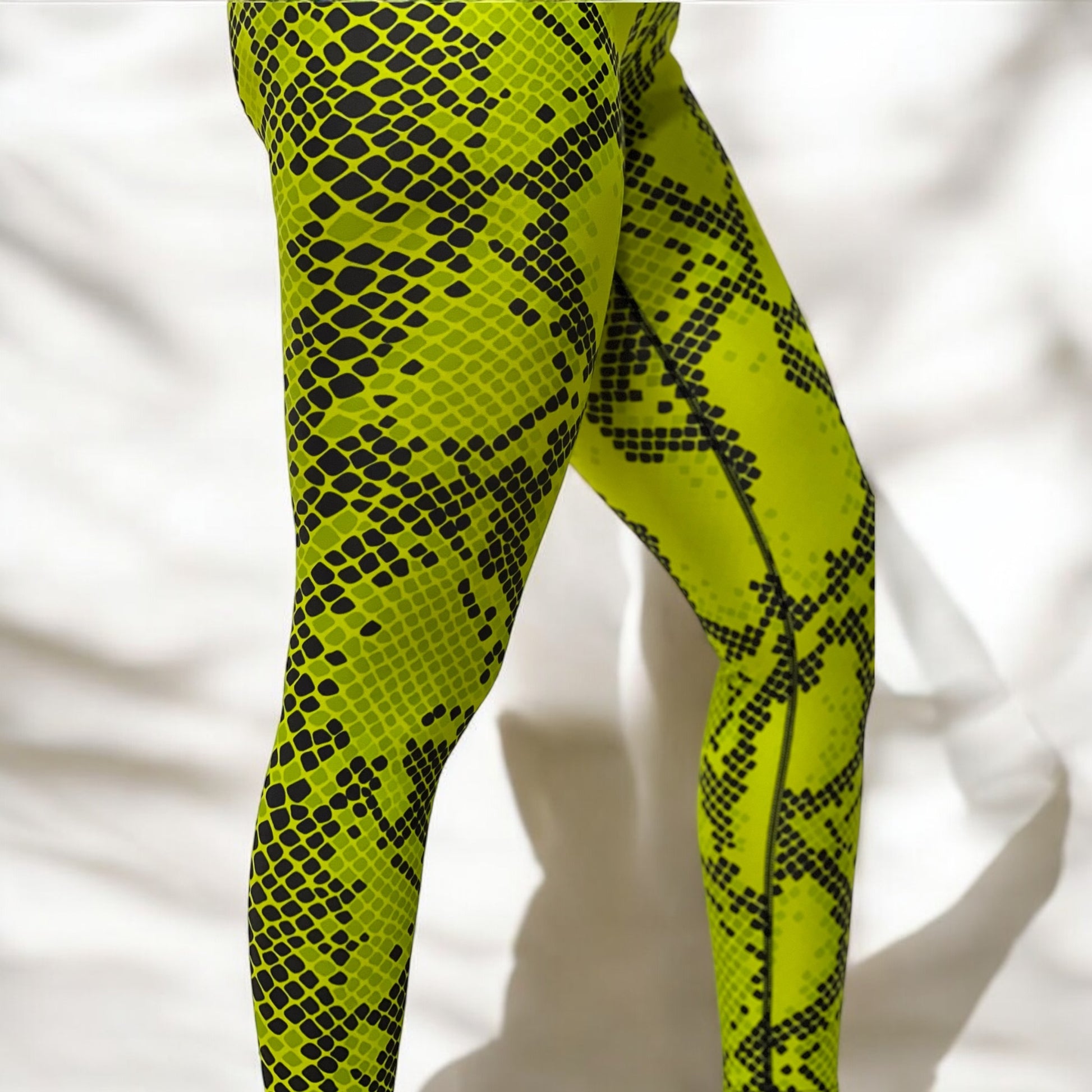 Our neon green snake print leggings are a bold and eye-catching addition to any fitness or casual wardrobe. Made with a high-quality, stretchable fabric, these leggings offer a perfect blend of comfort and style. The vibrant neon green color is accentuated by a striking snake skin pattern, giving a fierce and dynamic look that stands out. The leggings are designed with a high waistband to provide support and a flattering fit, making them ideal for workouts, yoga sessions, or simply making a statement on the go.