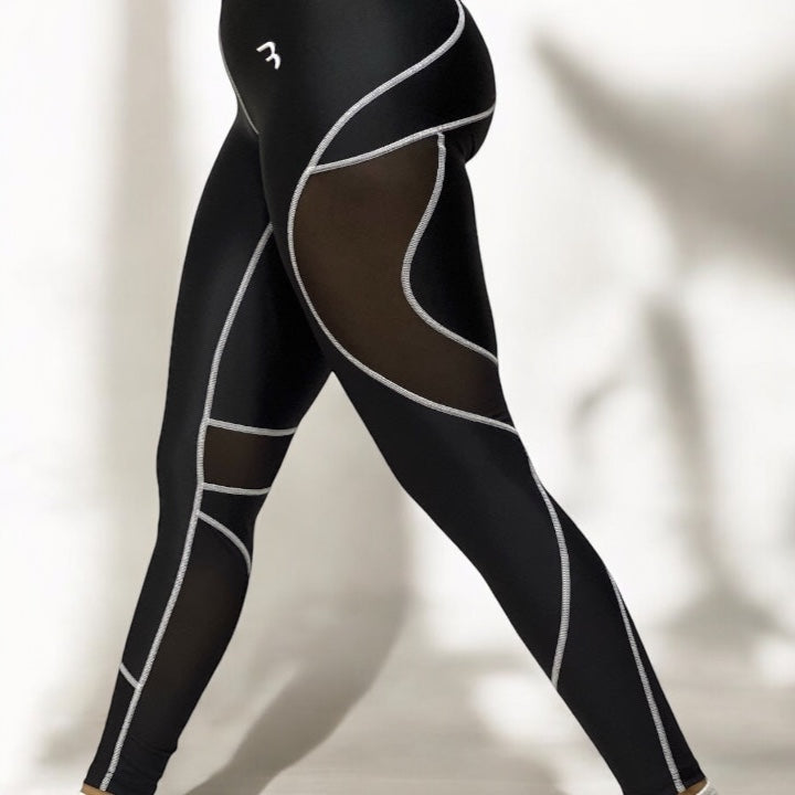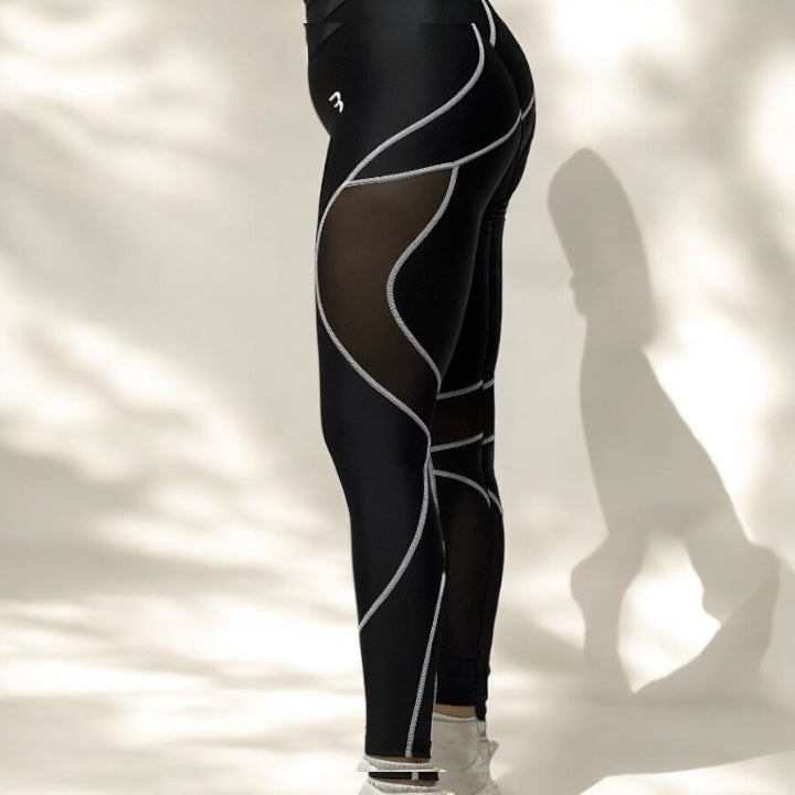 Imagine the perfect gym legging designed to elevate your workout style. These leggings boast a sleek, modern look with strategically placed mesh panels. The main body of the legging is crafted from a high-quality, moisture-wicking fabric that hugs your curves comfortably and provides excellent support during exercise.