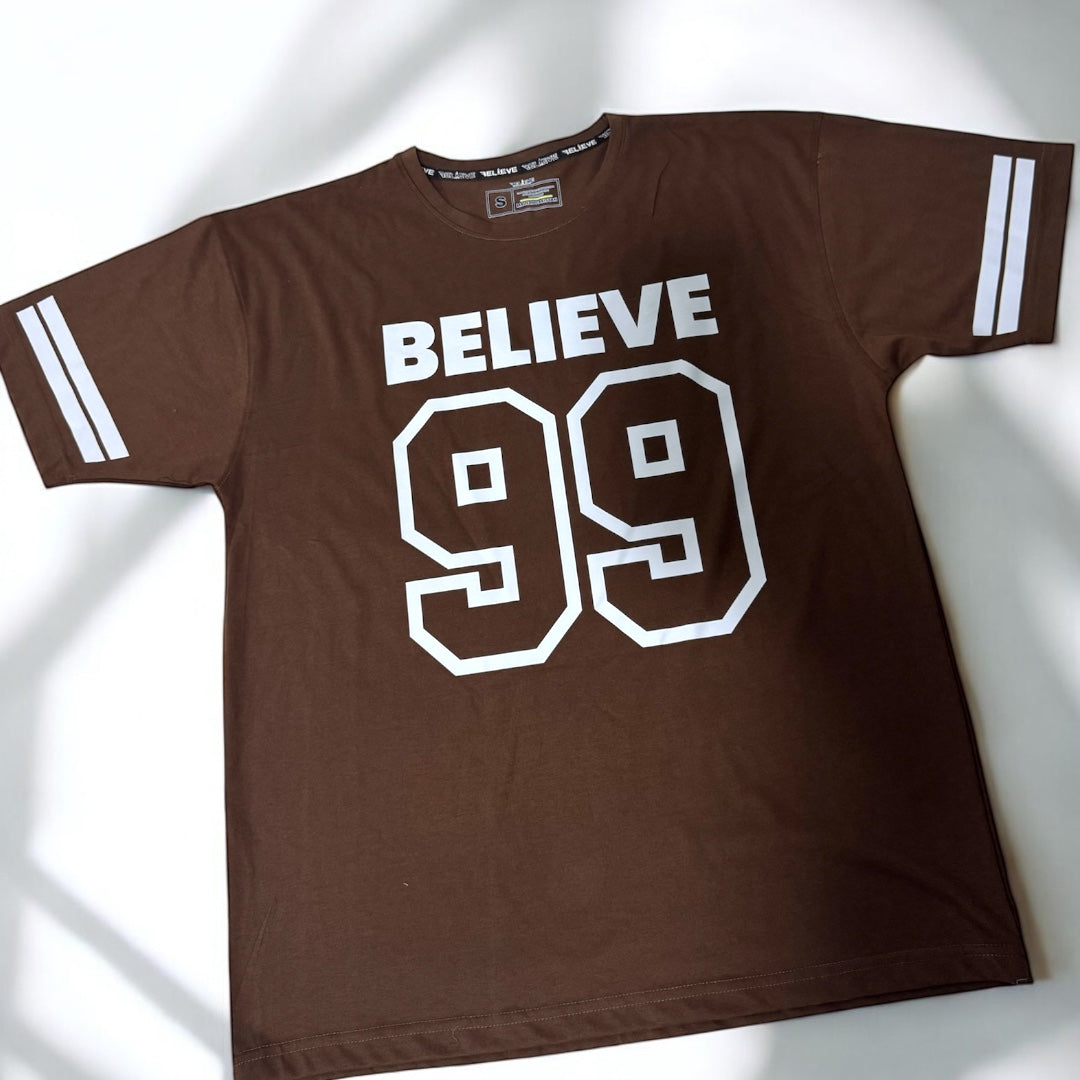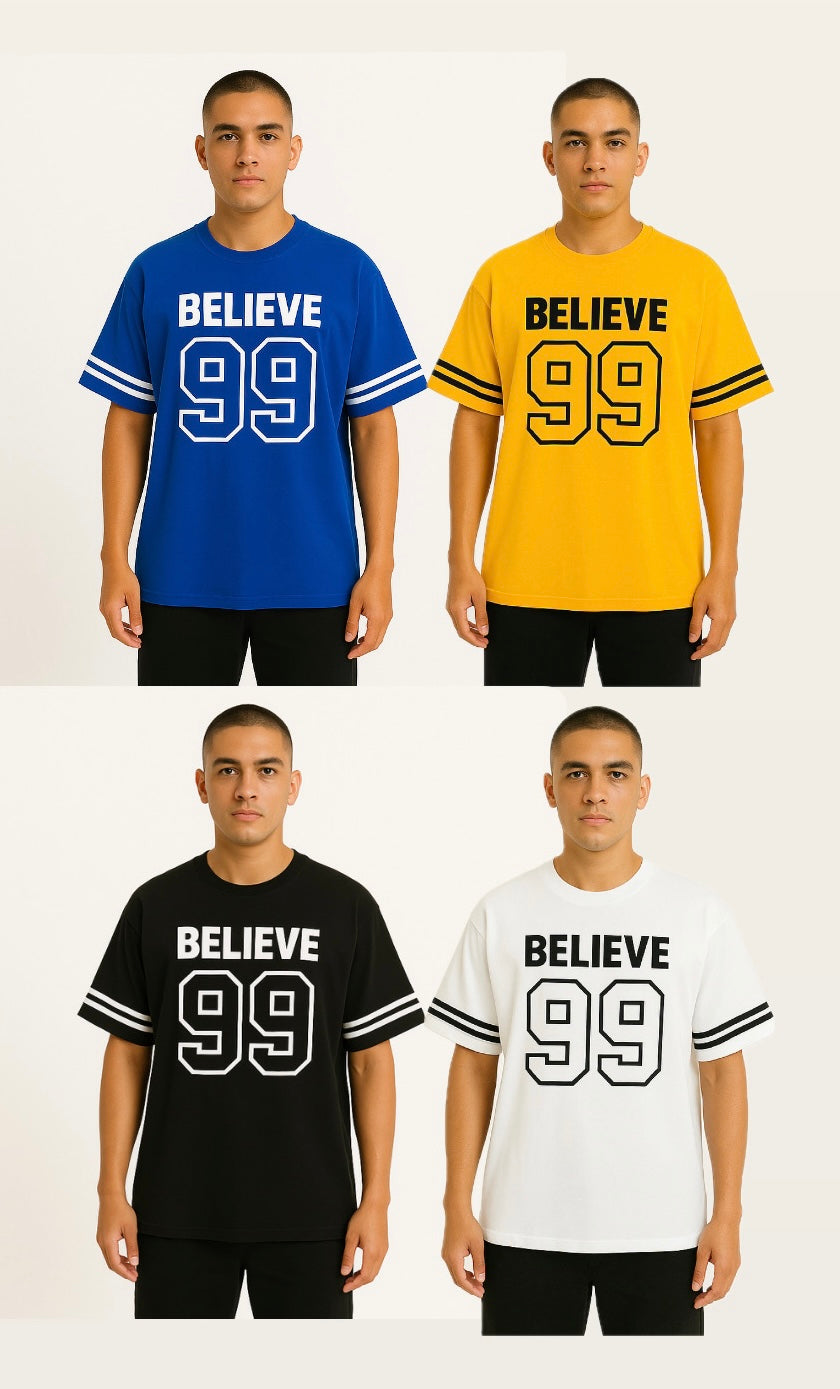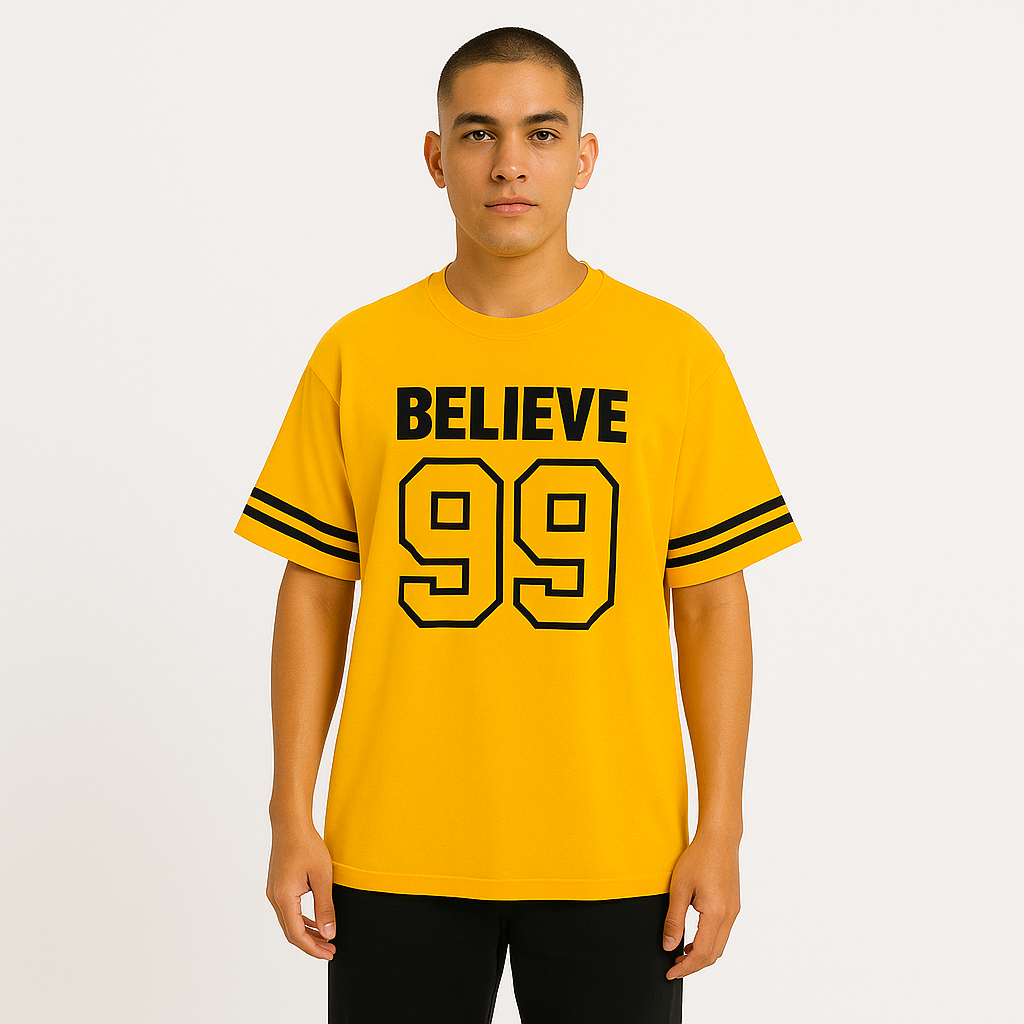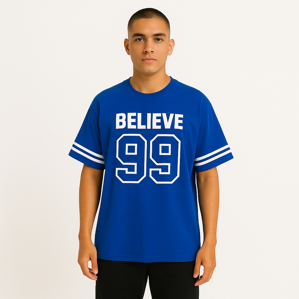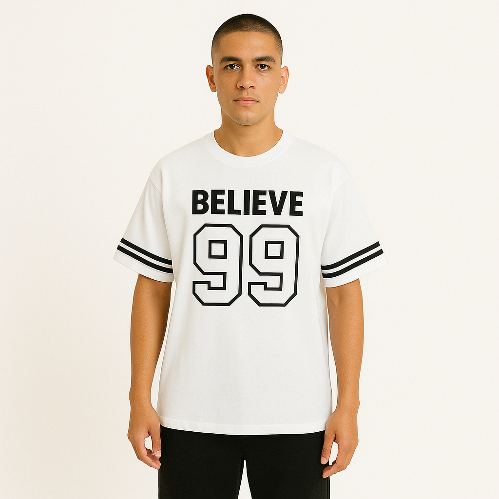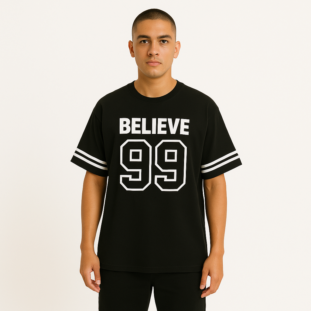 Step into timeless streetwear with the BELIEVE '99 Legacy Tee. Crafted for comfort and confidence, this oversized tee brings a classic varsity vibe with bold “BELIEVE” lettering and the iconic “99” print that speaks of ambition, grit, and legacy. Featuring double-striped sleeves for an athletic edge, it's perfect for making a statement—whether you're hitting the gym, the streets, or just chilling with the squad.
